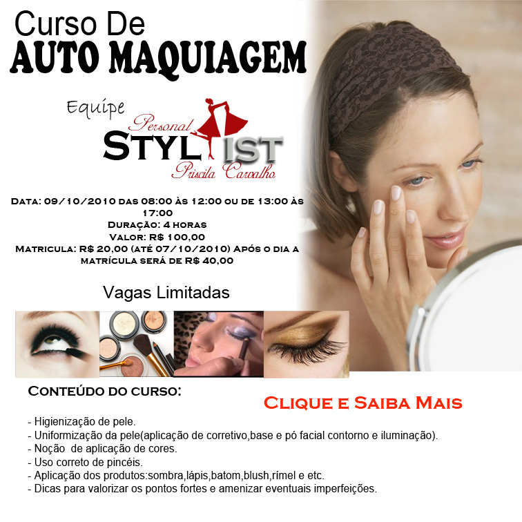 Depois de Muitas cobranças estamos lançando um curso(workshop)de auto-maquiagem que vai falar de muitas novidades e alguns segredos que fazem toda a diferença no make-up,foi bem complicado um espaço na agenda para encaixar esse curso, a estilização dos clientes exije tempo e dedicação já que é um trabalho personalizado, mais vocês merecem o esforço porque quero ver todas lindas e maravilhosas usando todas as armas possíveis para estarmos bem apresentadas e felizes com a auto-estima nas alturas.